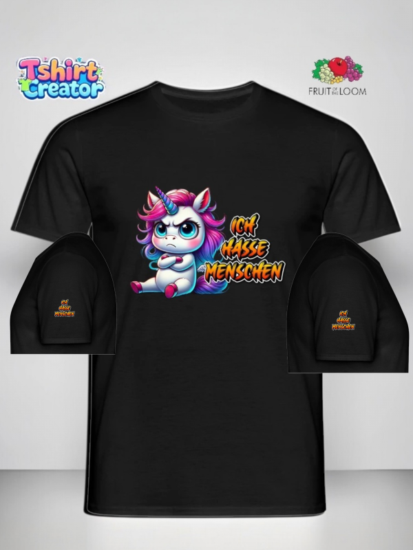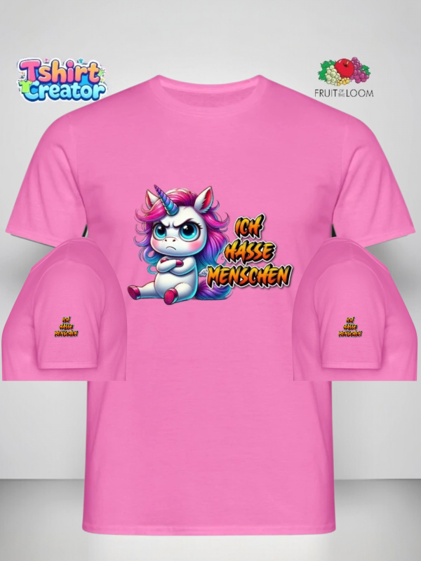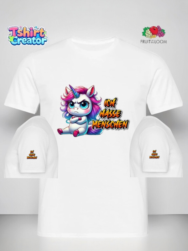 Dieses stylische T-Shirt von Fruit of the Loom überzeugt mit einem ausdrucksstarken Design: Ein süßes, aber genervt dreinblickendes Einhorn mit der klaren Botschaft „Ich hasse Menschen“. Das hochwertige Motiv erinnert optisch an ein beliebtes Tassen-Design und bringt genau diesen Humor jetzt auf dein Shirt.