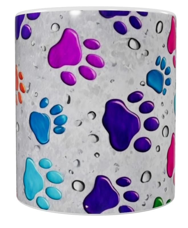 Diese liebevoll gestaltete Keramik-Tasse mit bunten Pfotenabdrücken begeistert mit ihrem fröhlichen Design und bringt Farbe in jeden Kaffee- oder Teemoment. Die glänzenden Pfoten in kräftigen Farben wie Blau, Pink, Lila, Grün und Gelb heben sich wunderschön vom dezenten grauen Hintergrund mit Wassertropfen-Effekt ab. Das rundumlaufende Motiv sorgt dafür, dass die Tasse aus jedem Blickwinkel ein echter Hingucker ist.