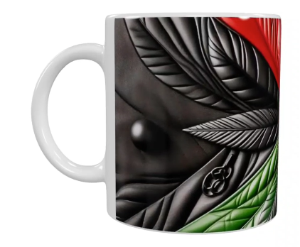 Auf allen Seiten der Tasse findest du detailreich gearbeitete, blattförmige Elemente, die optisch wie dreidimensional wirken und dem Motiv eine besondere Tiefe verleihen. Die Kombination aus Naturmotiven und ausdrucksstarken Farben schafft ein harmonisches, zugleich energiegeladenes Gesamtbild.