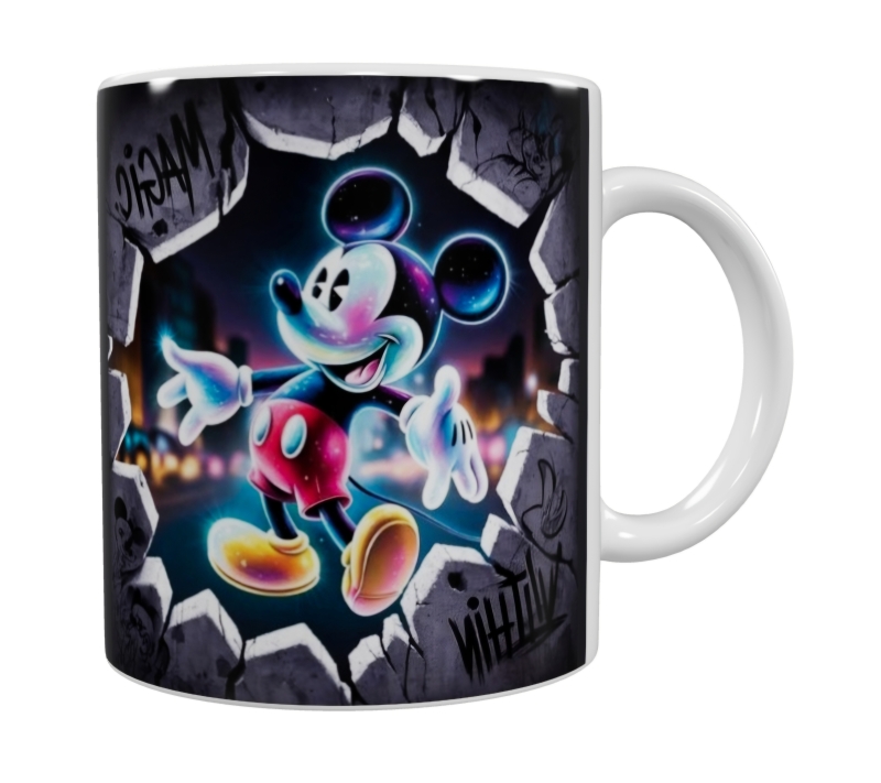 Diese außergewöhnliche Keramik-Tasse im Neon-Urban-Style bringt frischen Wind in deine Kaffeepause. Das Motiv zeigt eine ikonische Mausfigur im leuchtenden Graffiti-Look, die scheinbar durch eine aufgebrochene Wand tritt. Mit ihren strahlenden Farben und dem urbanen Hintergrund wirkt das Design modern, kreativ und voller Energie.